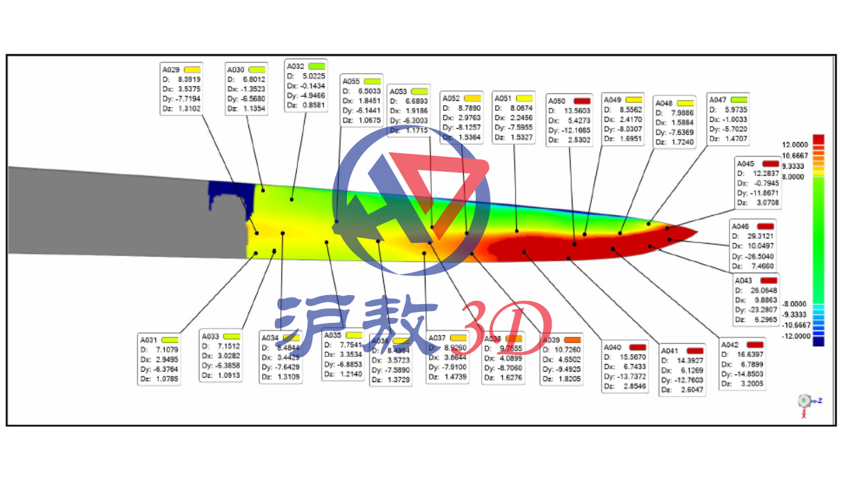 在得到叶片的三维模型后,将其导入第三方检测软件中,与设计数模进行比对,测量出各处偏差值。从而帮助客户找到产品尺寸问题,指导改进生产。