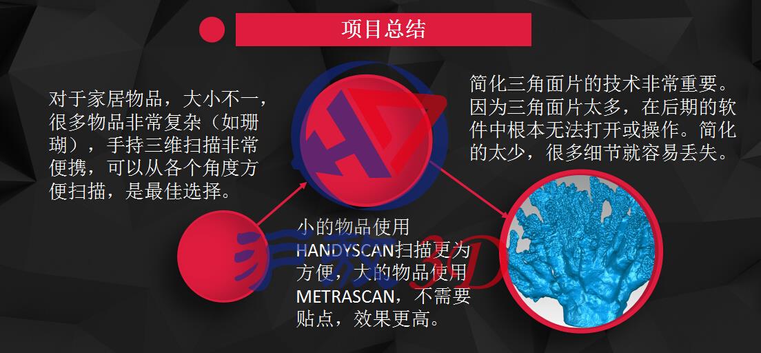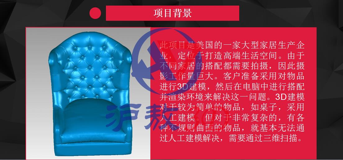 此项目是美国的一家大型家居生产企业。由于不同家居的搭配都需要拍摄,因此摄影工作量巨大。客户准备采用对物品进行3D建模,然后在电脑中进行搭配并渲染环境来解决这一问题。3D建模对于较为简单的物品,如桌子,采用人工建模。但对于非常复杂的,有各种不规则曲面的物品,就基本无法通过人工建模解决,需要通过三维扫描。